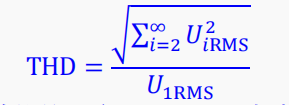 全谐波失真 (Total Harmonic Distortion-THD)本身是衡量一个时域波形与标准正弦波的差异程度的量,其原始定义为:时域波形中包含基波分量有效值 U1RMS,以及各次谐波分量 U2RMS、U3RMS、U4RMS……等,则
