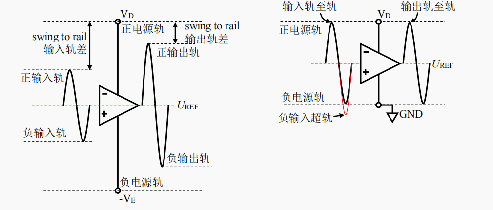 当运放最大输入电压范围与电源范围比较接近时,比如相差 0.1V 甚至相等、超过,都可以叫“输入轨至轨”,表示为 Rail-to-rail input,或 RRI。