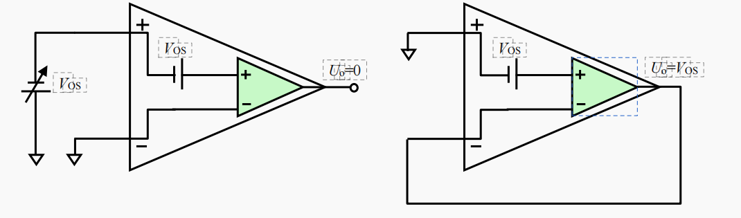 分析:任何一个实际运放都可理解为正端内部串联了一个 VOS,然后进入一个理想运放,如下图所示。如左图,正端引入一个-VOS,则输出为 0,符合标准定义。如右图,跟随器正 端接地,实际输出即为 VOS,也符合标准定义。
