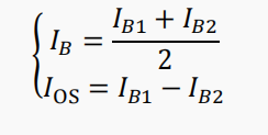 规定电路中运放正端外部电位 U+,负端电位 U-,从正端流进电流为 IB1,负端流进电流为 IB2,则输入偏置电流 IB和输入失调电流 IOS 分别为: