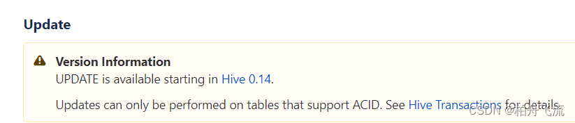 Hive官方提示,Hive在版本0.14之后可以支持对表数据的UPDATE和DELETE: