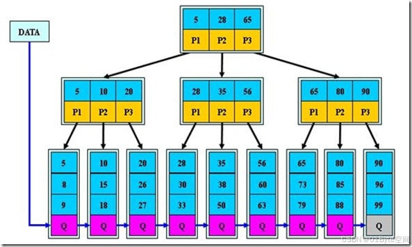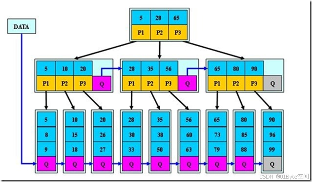 - B+tree:B+tree的叶子节点通常是链表式连接的,即每个叶子节点都指向下一个叶子节点。这使得B+tree在范围查询时非常高效,因为可以沿着叶子节点链表顺序访问数据。