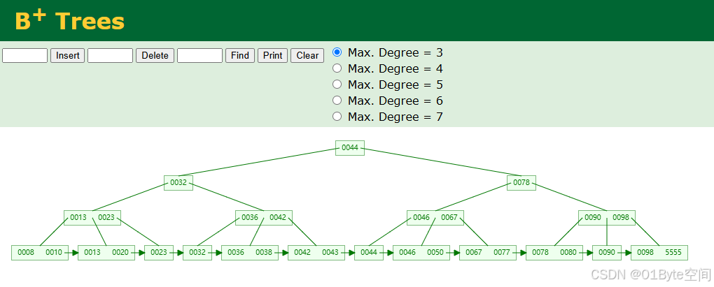 体验B+tree的结构操作,可参考网站:B+ Tree Visualization