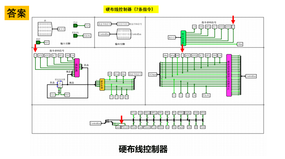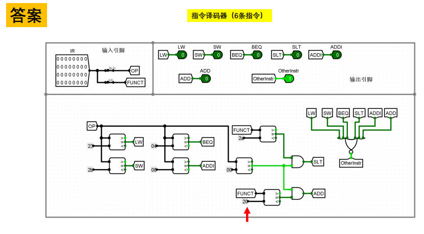 因此修改方式是:将OP码与000000相比较,将FUNCT码与200000相比较,因为同时成立在执行ADD,因此将这两道信号进行“与”操作,因此用与门进行连接。