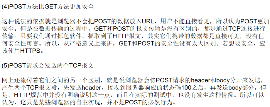 (5) 幂等性:Get方法是幂等的,即多次请求同一个URL返回的结果是一致的,不会对服务器产生副作用。Post方法不是幂等的,多次请求可能会对服务器产生不同的影响。