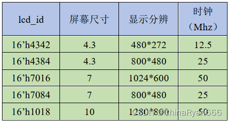 除此之外,为了方便将 LCD 的 ID 和分辨率对应起来,这里对 M2、 M1 和 M0 的值做了一个译码。 如 3’b000 译码成 16’h4342,表示当前连接的是 4.3 寸屏,分辨率为 480*272。 其它 ID 的译码请参考下图所示: