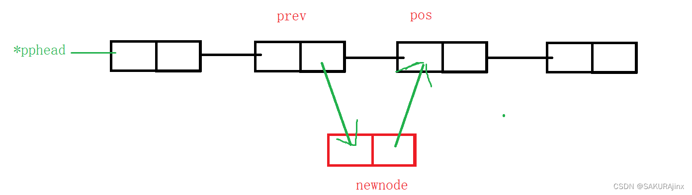 这里注意不能直接找到pos位置插入,因为单链表是单向的,不能后一个节点找前一个节点的位置,所以要创建一个prev指针去找pos前一个节点的位置。