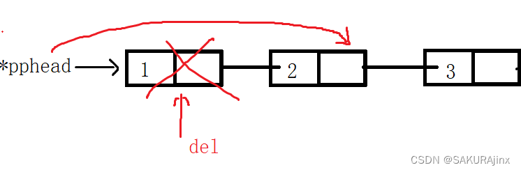 头删的时候注意要先记录第一个节点,然后将其free掉,否则*pphead指向第二个节点就找不到第一个节点了。