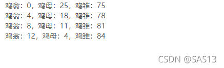 printf("鸡翁:%d,鸡母:%d,鸡雏:%d\n",a,b,c);