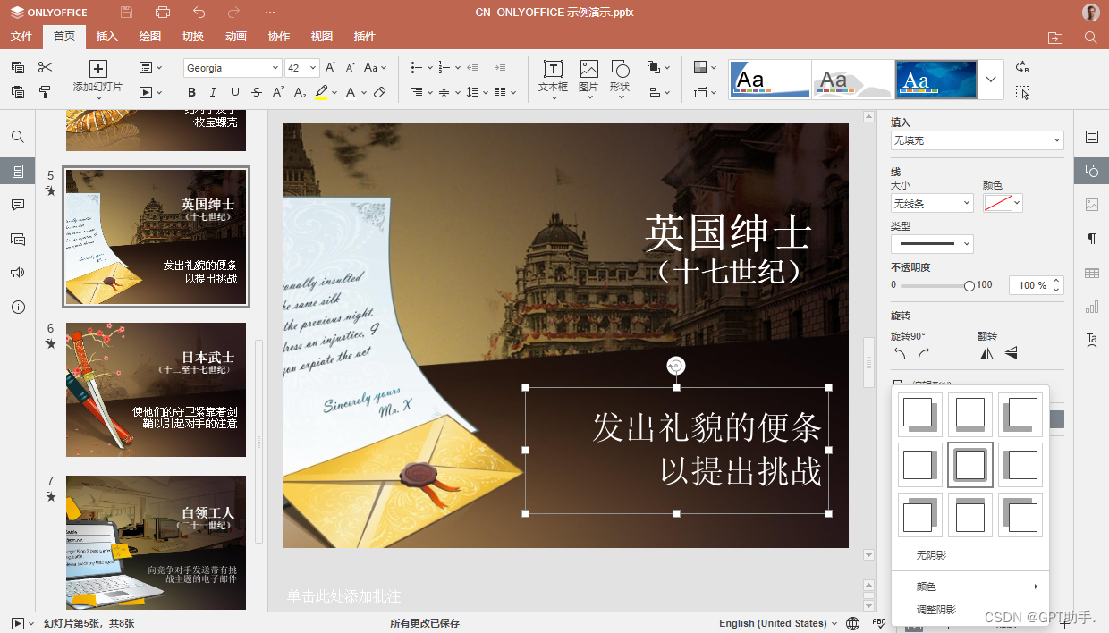 在最新版本的ONLYOFFICE中,所有编辑器都进行了一系列的改进和优化。首先,ONLYOFFICE增加了对形状的阴影设置,让用户能够为文本框、图形和其他对象添加逼真的阴影效果。其次,新版本提供了更多的配色方案选择,让用户能够根据自己的喜好或品牌风格,轻松地自定义文档的外观。最后,ONLYOFFICE还改进了对右至左语言的支持,这意味着使用阿拉伯语、希伯来语等从右至左书写的语言的用户,将能够更加顺畅地使用编辑器。