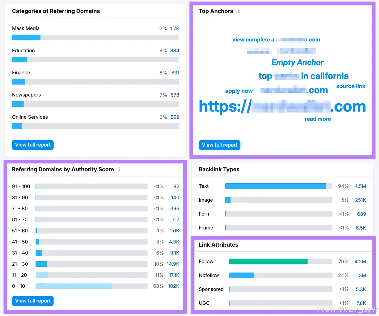 - 反向链接:注意你收到的反向链接总数以及你拥有多少推荐域名