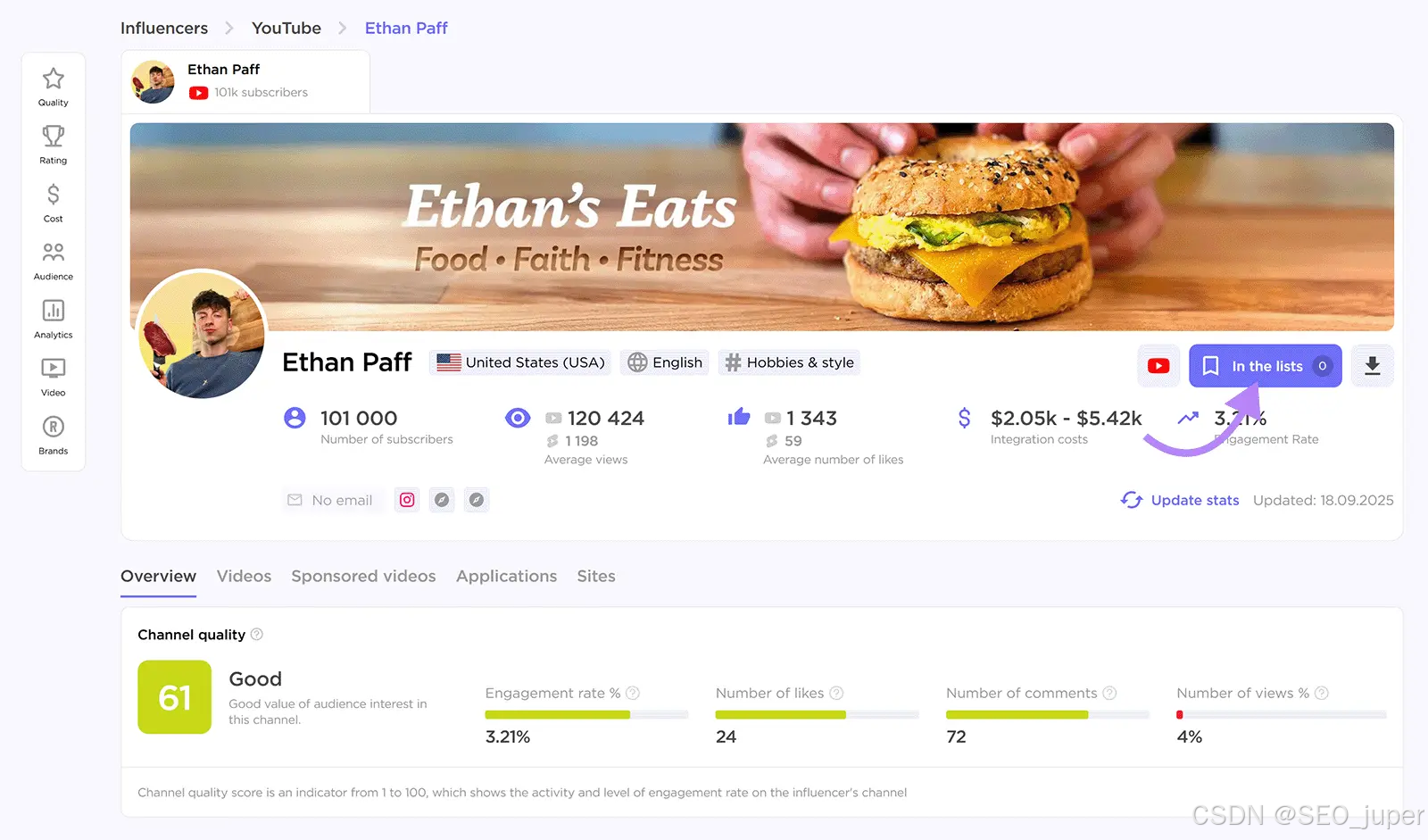 点击某个网红的个人资料,获取更多信息及联系方式。点击“在名单中”,将他们添加到现有列表,或创建你想联系的网红新名单。