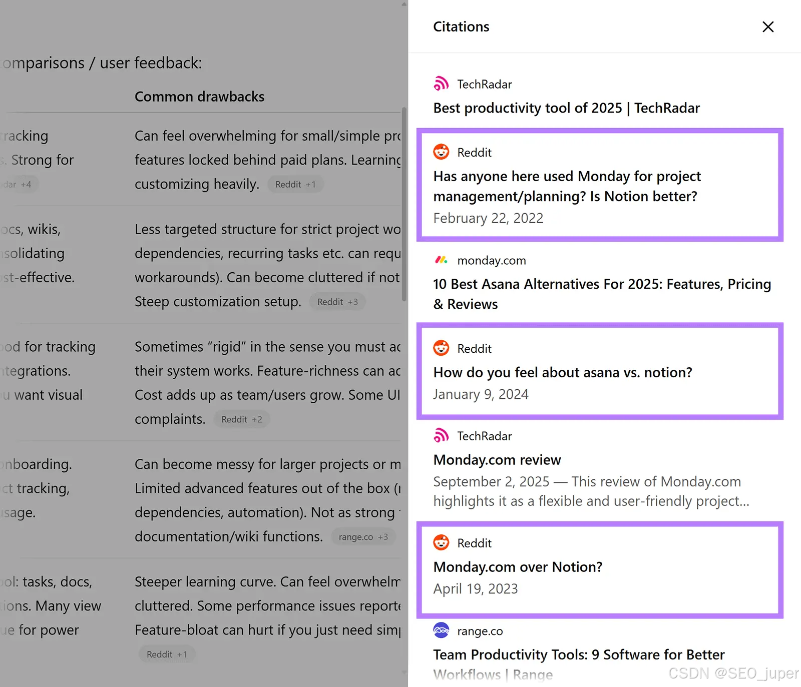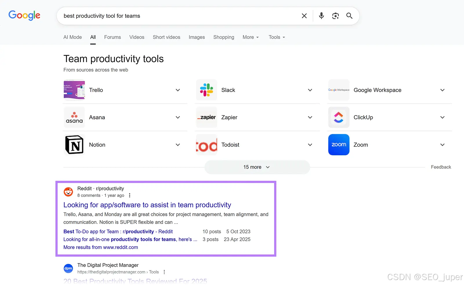 自从谷歌与Reddit达成授权协议后,论坛内容在搜索结果中出现的频率明显上升。尤其是像“团队最佳生产力工具”这样的商业问题。