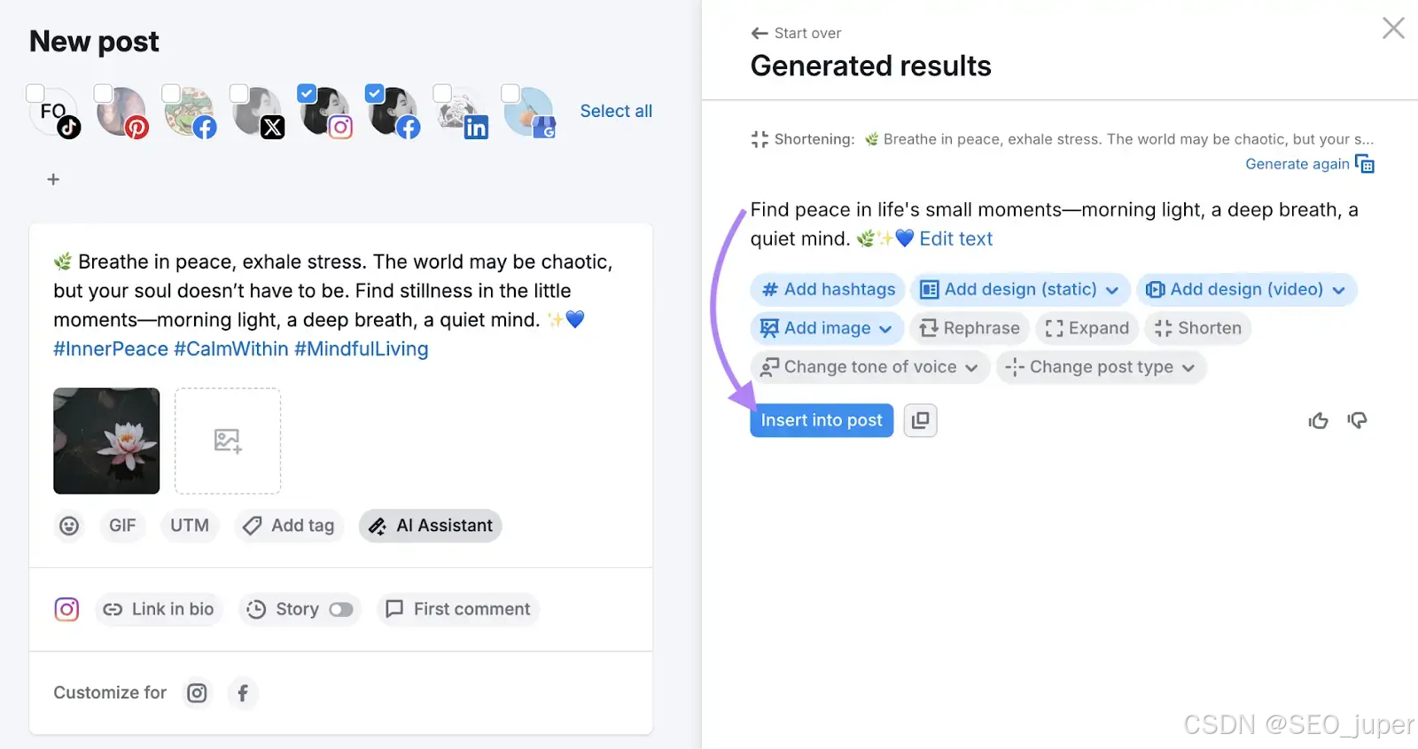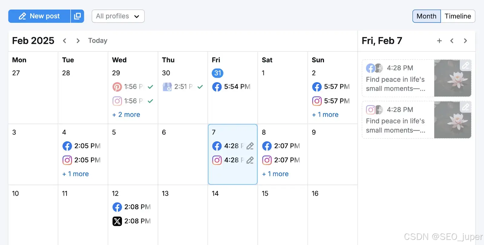 这个工具可以让你在不同平台上安排和发布帖子。你还可以用AI来草拟你的内容。