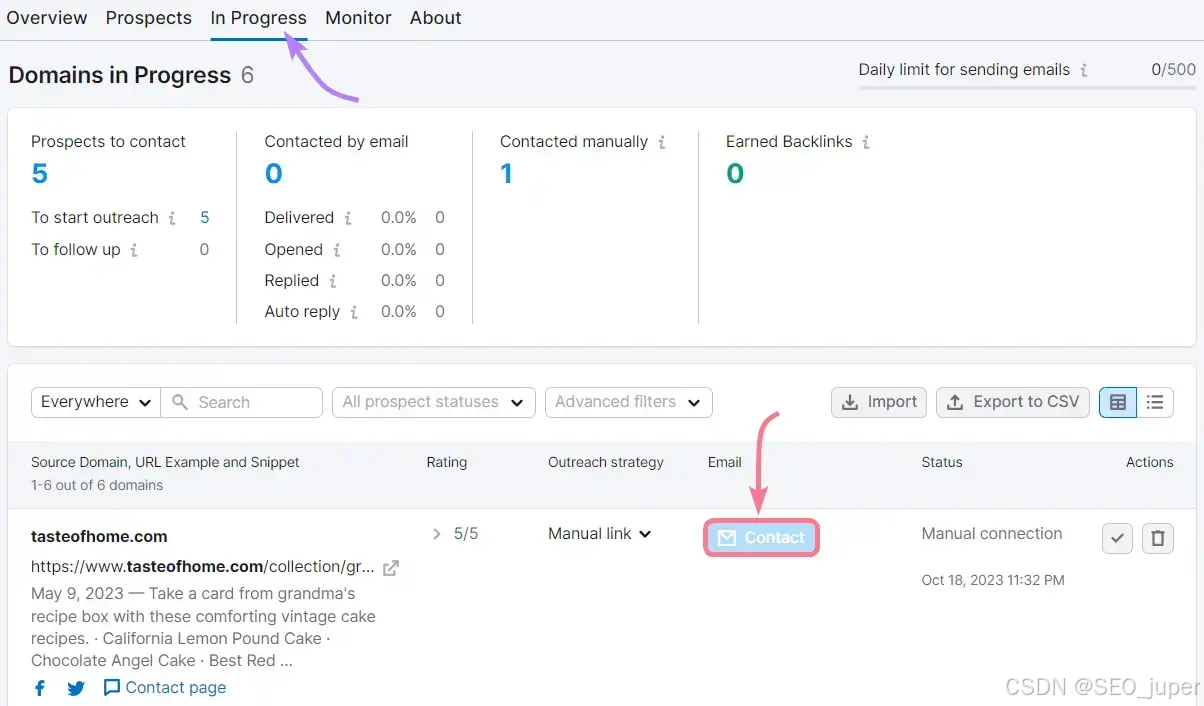 点击“联系”,在链接建设工具中给潜在客户发送邮件。可用的联系邮箱地址将自动添加。
