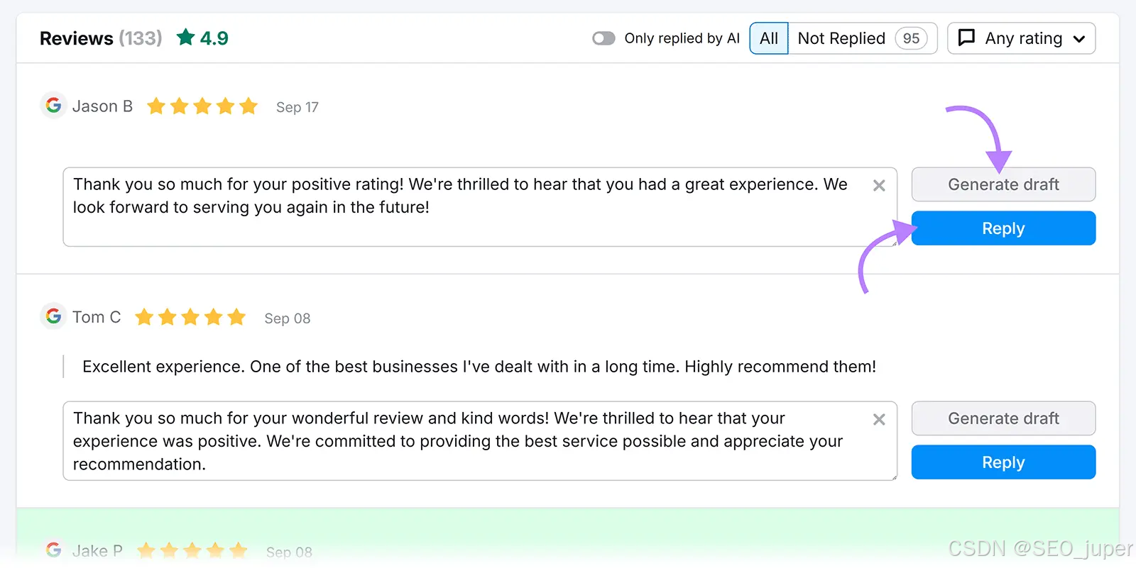 或者使用Semrush的评论管理工具来回复Google评论。并且会收到其他目录的评论通知。