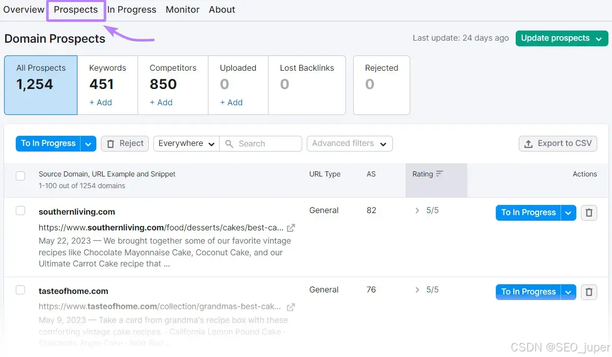 一旦你从潜在客户那里获得反向链接,点击右侧列的勾选,将该网站移到“监控”标签页。这样你就能追踪是否丢失了该反向链接,或者某个推荐域名是否已不再有效。