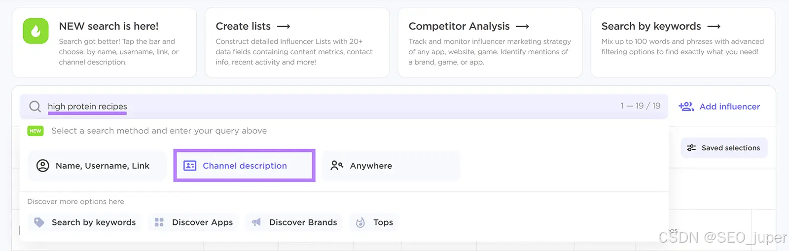 然后,在搜索栏输入你想要的网红类型。并选择搜索方式——我们推荐“频道描述”。
