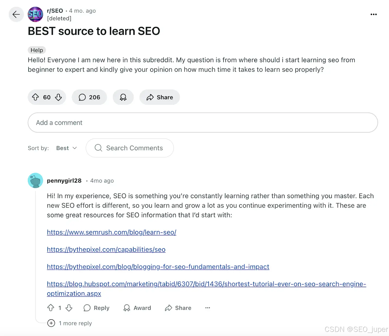 例如,下面的图片显示了一位用户在Reddit帖子中分享对SEO初学者有用的资源: