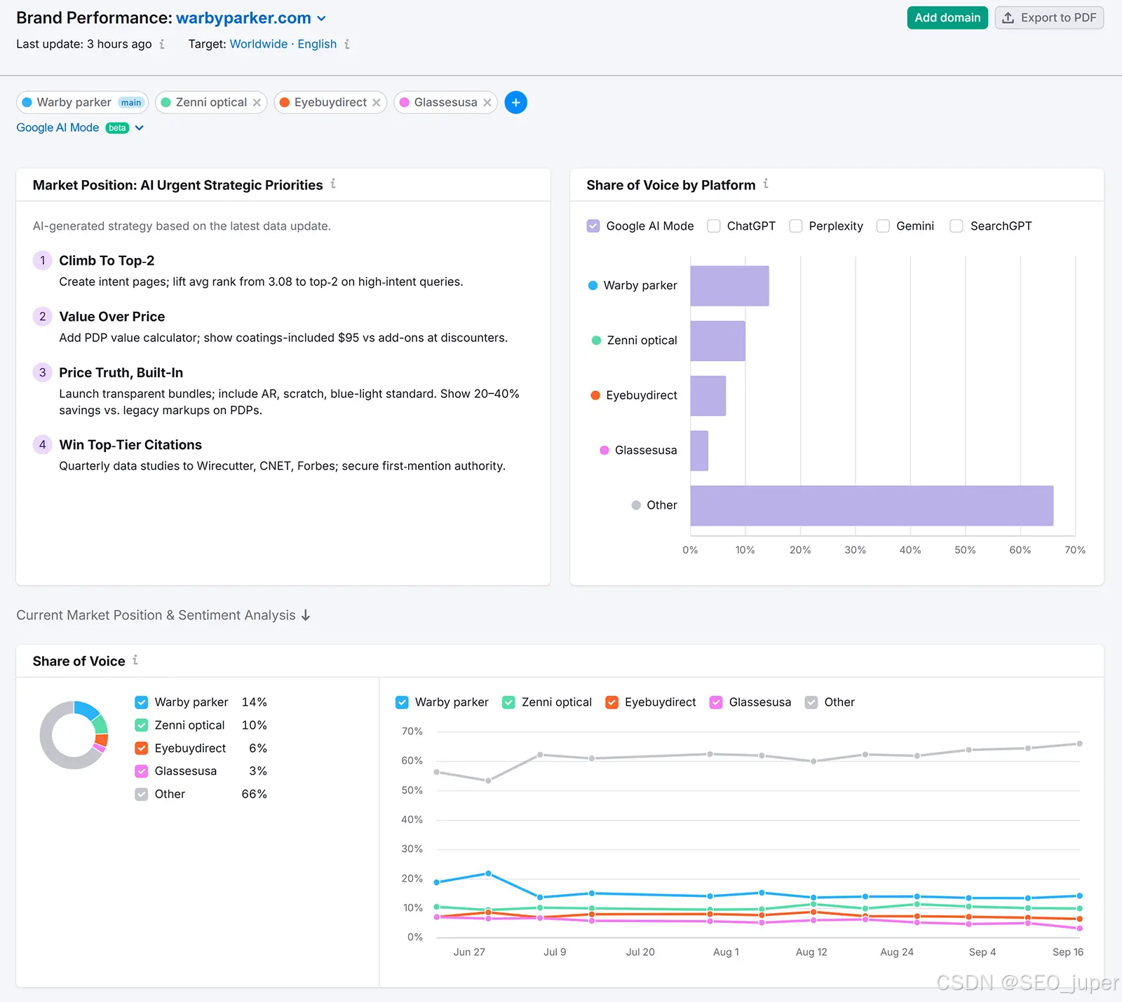 想了解你的页外工作对你在AI工具中的表现有何影响,可以使用Semrush的AI可视化工具包。这样你就能监控自己相对于竞争对手的声音份额,查看你在特定AI回复中的表现,甚至获得策略建议。