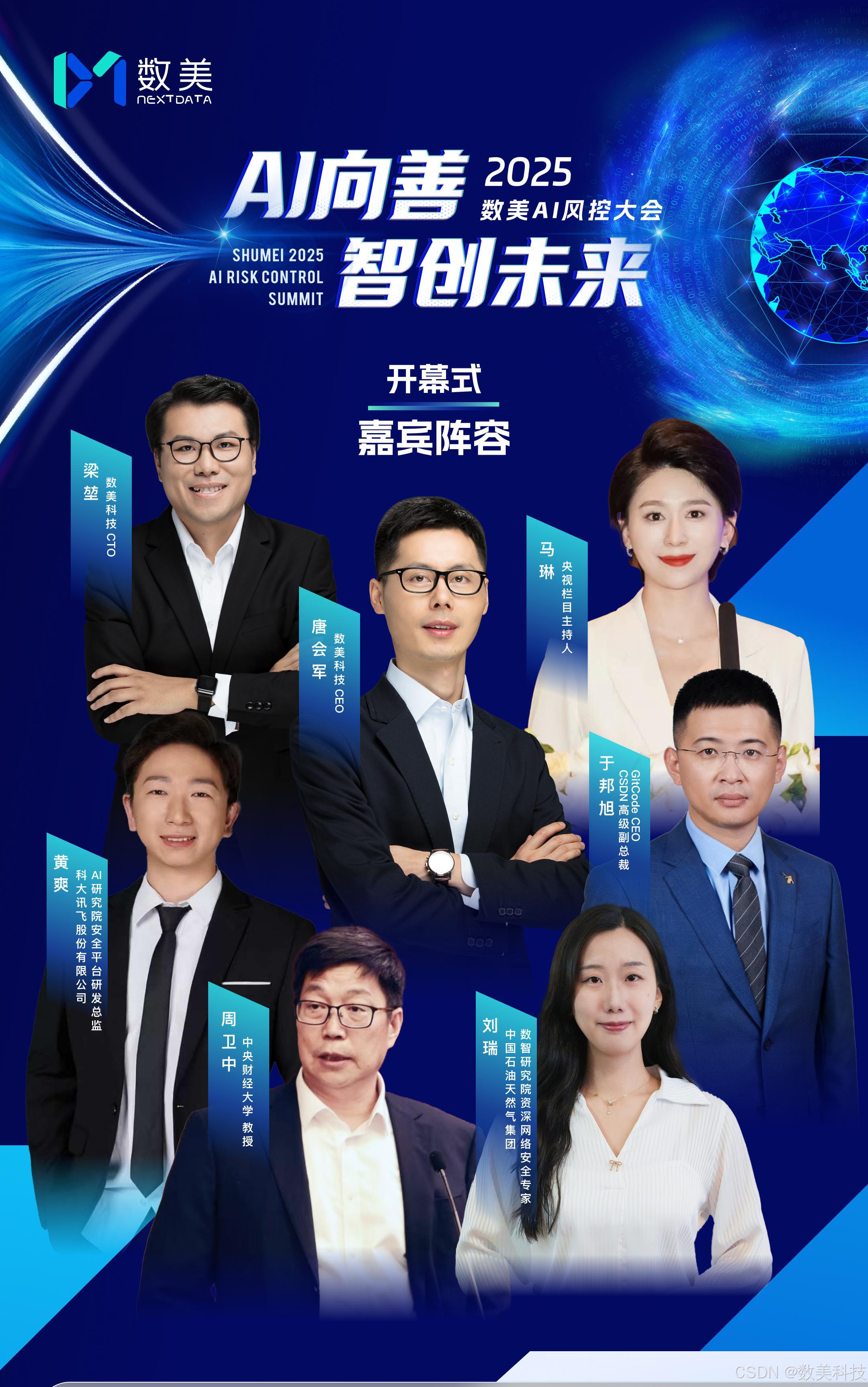 面对这一挑战,数美科技作为 AI 风控领域的领军者与先行者,发起以“AI 向善,智创未来”为主题的“数美 2025 AI 风控大会”,搭建深度对话、交流平台。其中,开幕式主论坛汇聚顶尖学者、央企高管及行业领袖等重磅嘉宾,将展开一场关于 AI 伦理、安全与未来的顶层对话,探寻“ AI 向善”的价值内核与实践路径。