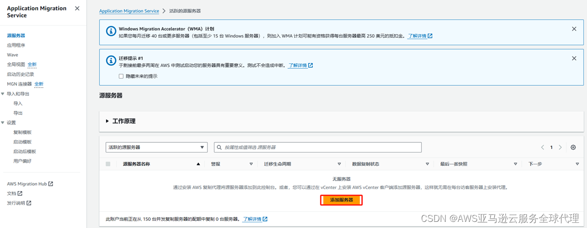 返回mgn控制台,在左侧导航栏找到源服务器,添加源服务器