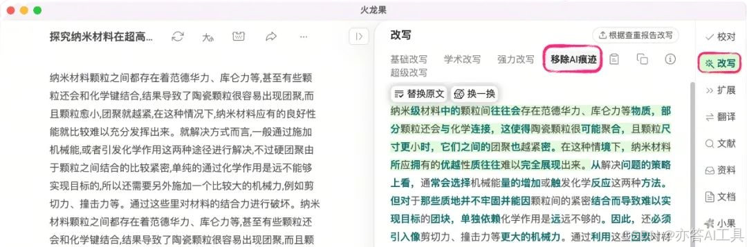 笔灵之后,火龙果也上线了「降AI率」功能。该功能可以对AI生成的内容进行改写,通过调整文章用词和整体风格来降低AI率。
