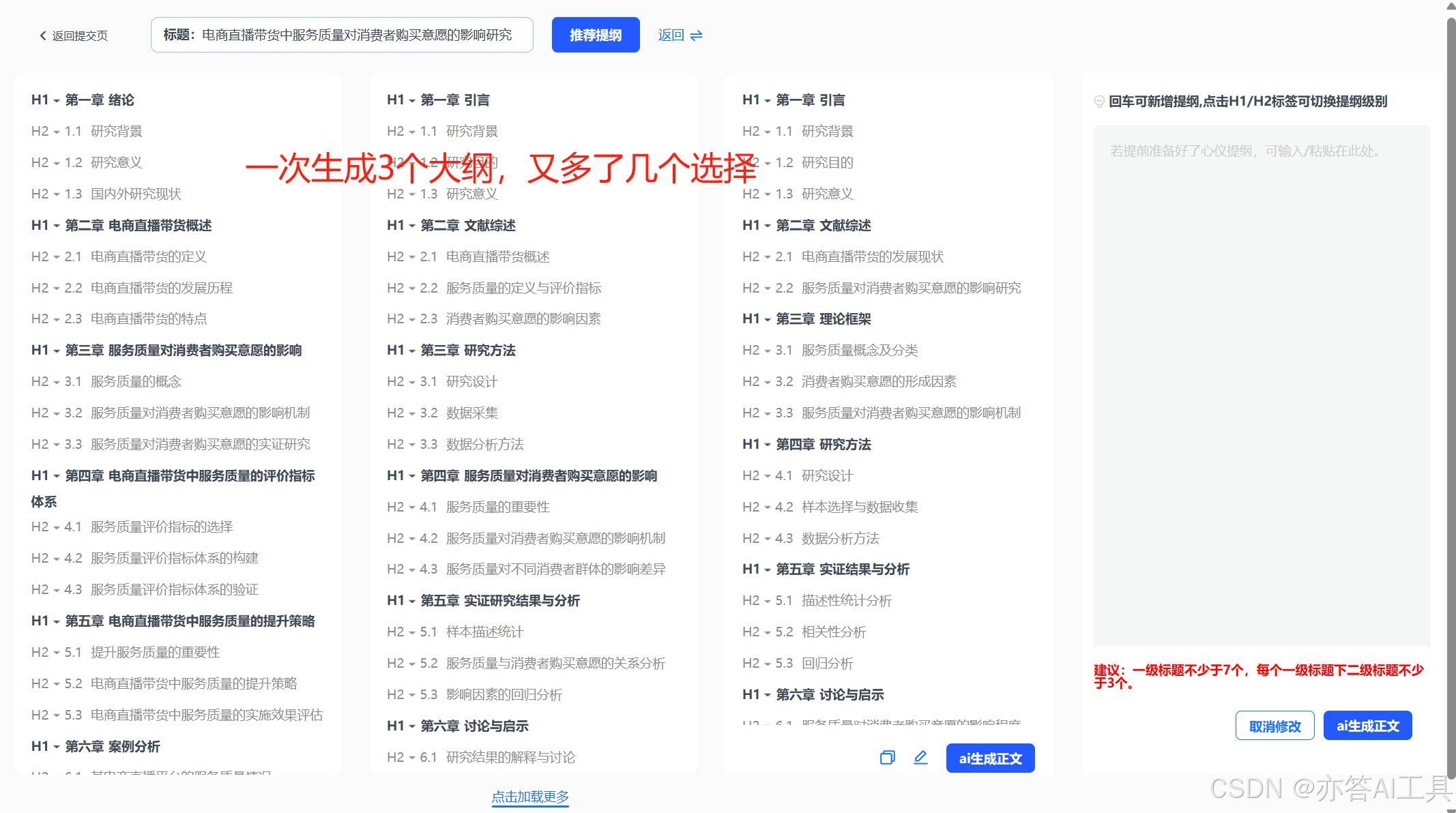 下面是我生成的管理科学与工程专业的研究生毕业论文“电商直播带货中服务质量对消费者购买意愿的影响研究”的三个大纲。