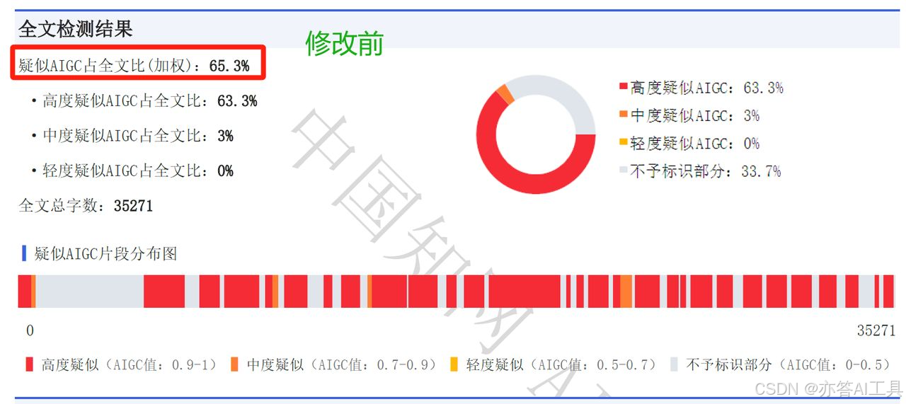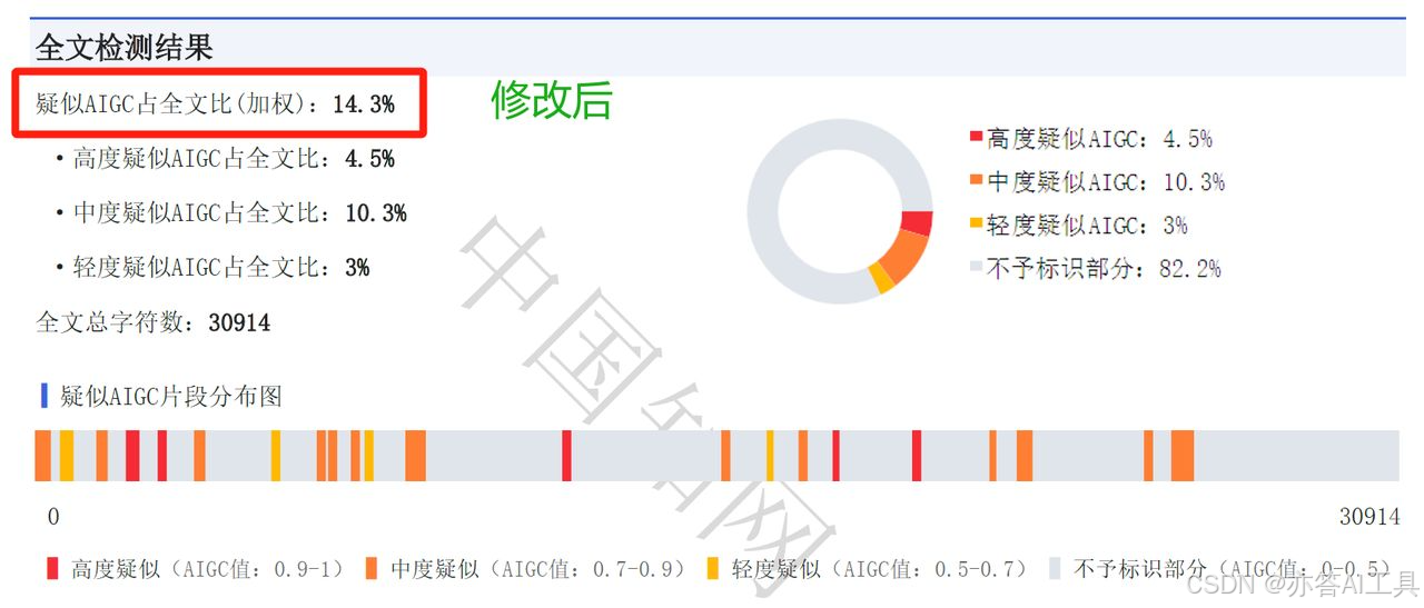 为了验证修改效果,我特地花巨款去知网检测了一下,下面来看一下全文检测结果以及疑似AIGC片段分布: