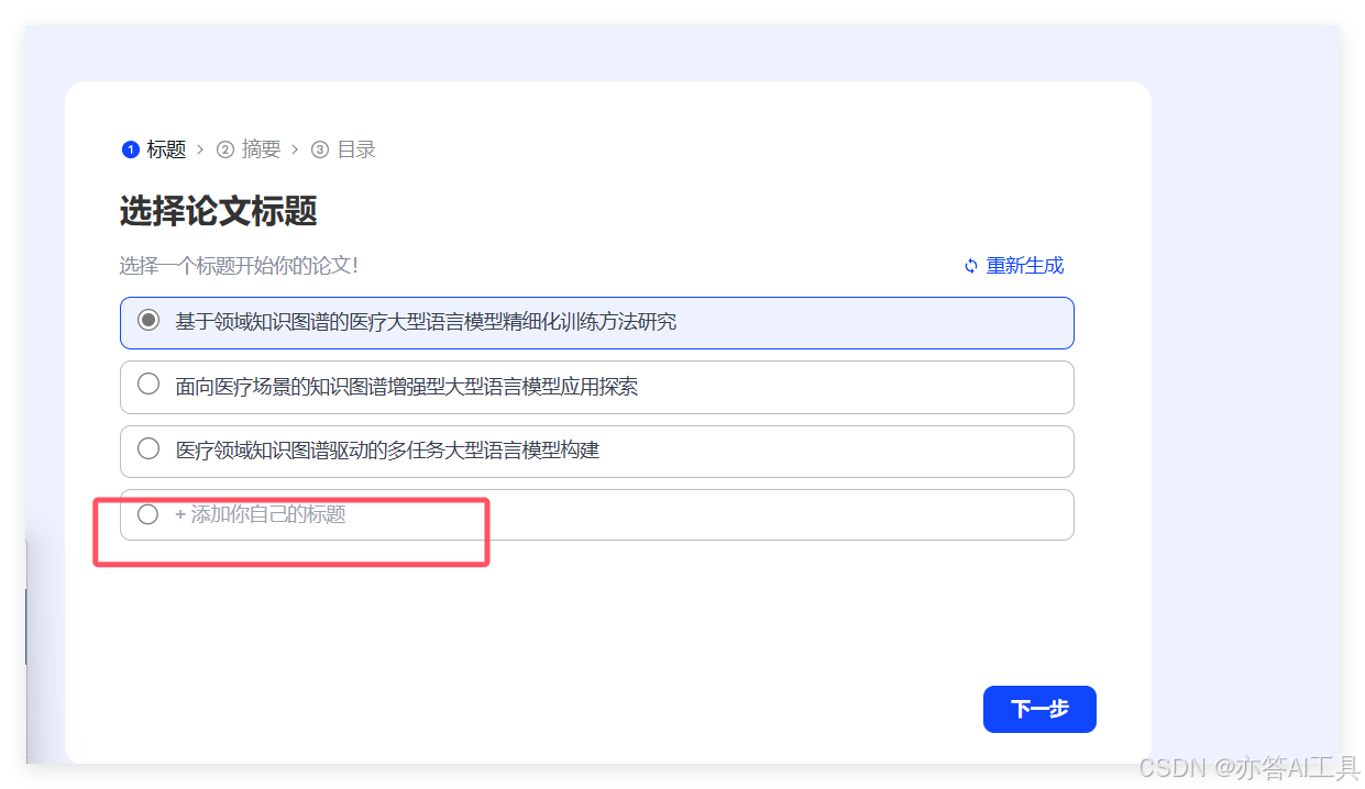 下面我来用“基于领域知识图谱的医疗大型语言模型精细化训练与应用”这个选题演示一下操作步骤。