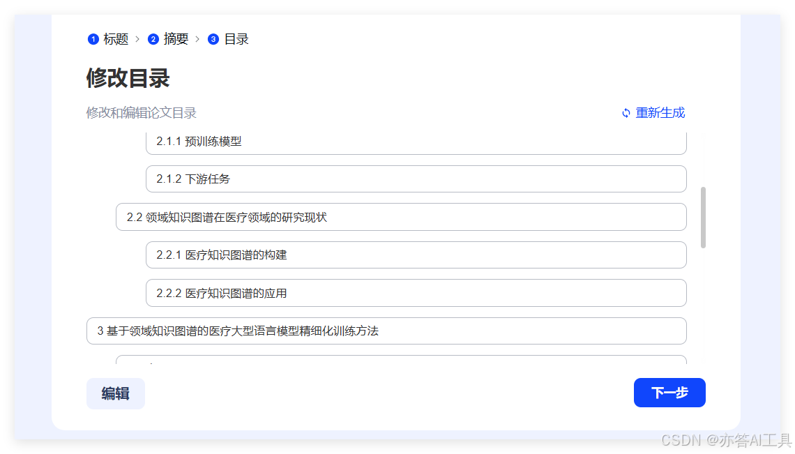 接着基于你的研究方向,帮你免费生成了摘要,同样的,可以自行编辑修改20秒左右,目录就生成完毕。此时可以浏览目录内容,如果不满意,就进行在线修改。