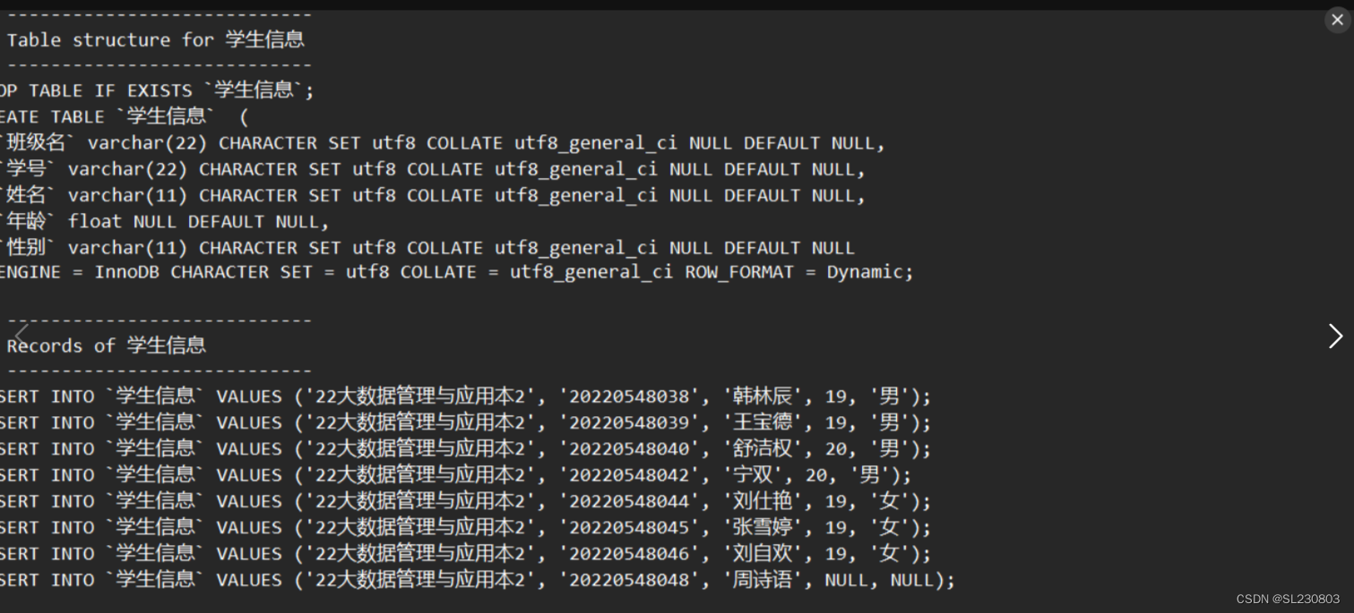 MySQL创立表格基础操作 1.创建表格 输入 create table score_info (name varchar(20),student_id varchar(20),mysql_score int,python_score int );2.添加内容 输入 insert into score_info values ('liushiyan','2022',100,100);创建一个成绩表,同时满足4个字段(用户学号、姓名、MySQL成绩、python成绩),4个字段类型 int。--查询当前数据库管理系统里面的数据库。