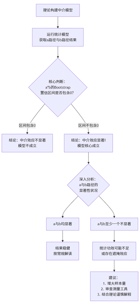上图清晰地展示了,Bootstrap置信区间是否包含0是唯一的终极判断准则。即使a和b路径双双不显著(流程右侧路径),只要置信区间不包含0,我们依然可以得出“中介效应显著”的结论。此时,a和b的不显著是下一步需要探讨的问题,而非否定模型的理由。