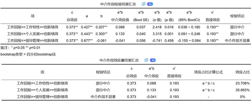 - 若区间包含0:则接受零假设,认为中介效应不显著,模型在此数据样本下未能成立。