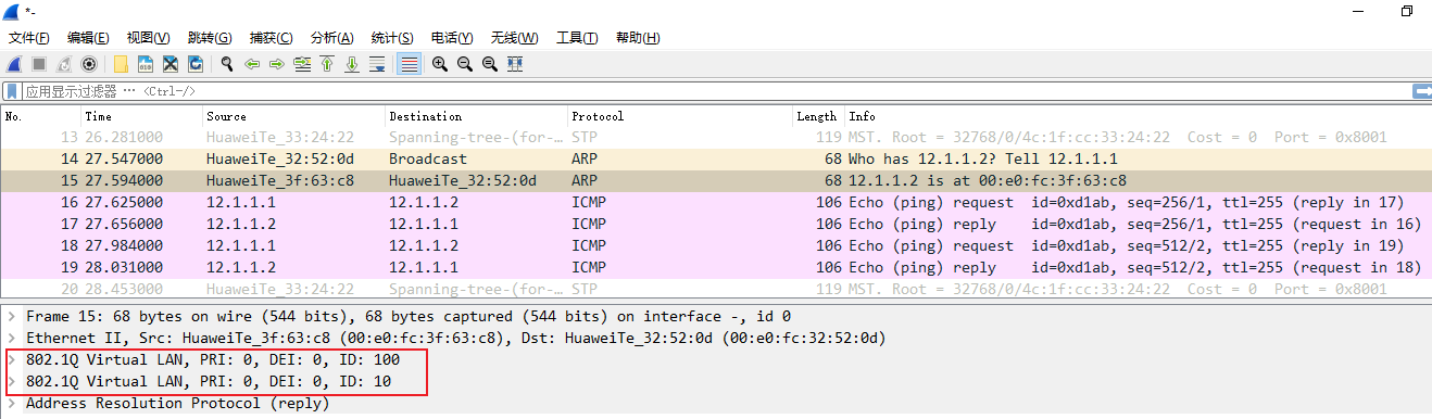 在SW2的G0/0/2口抓包,可看到两层VLAN tag