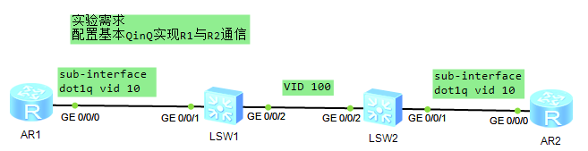 开启二层协议透传LLDP,查看AR1与AR2是否能通过QinQ隧道发现对方(模拟器无法观察到现象)