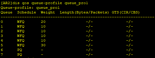 WFQ:通过优先级映射把流量标记为本地优先级,每个本地优先级对应一个队列号。每个接口预分配8个队列,报文根据队列号进入队列。默认情况,队列的WFQ权重相同,流量平均分配接口带宽。用户可以通过配置修改权重,高优先权和低优先权按权重比例分配带宽。