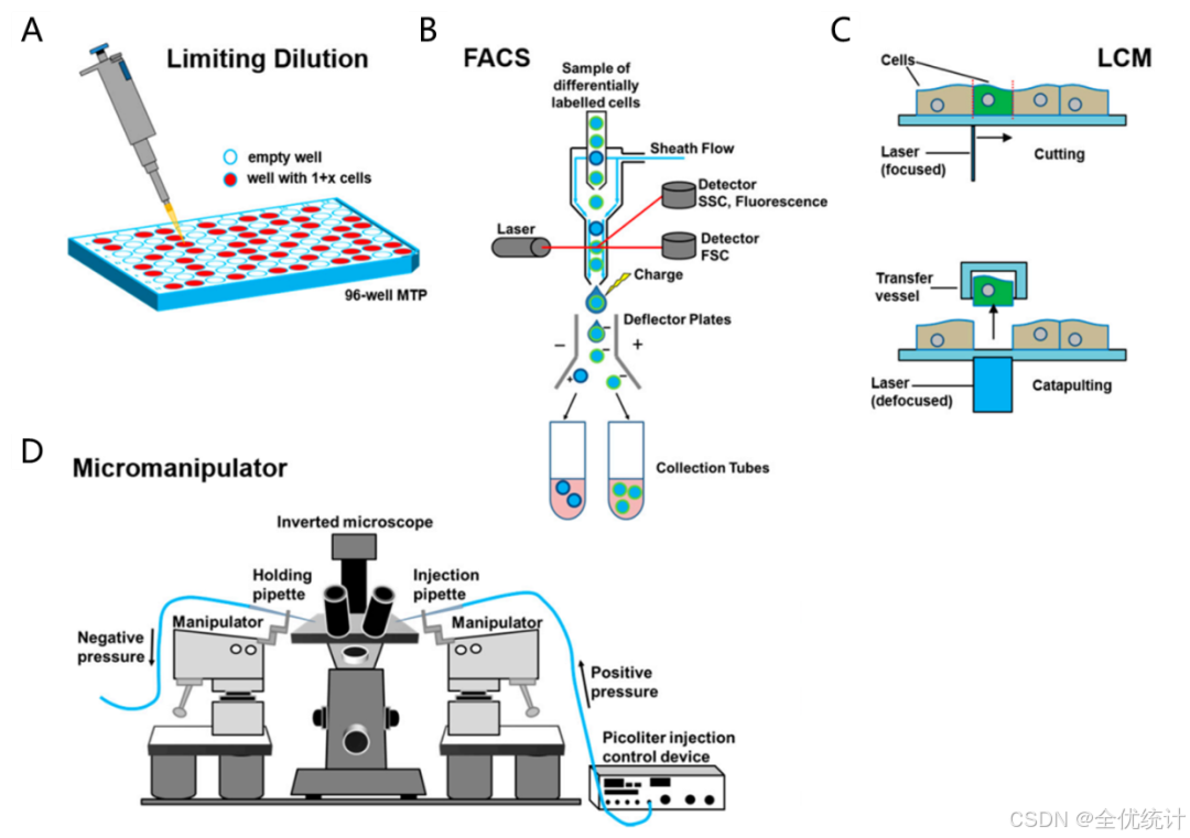 单个细胞的主要分选方式:A. 有限稀释法;B. 流式细胞分选法;C. 激光切割法;D. 显微操作法