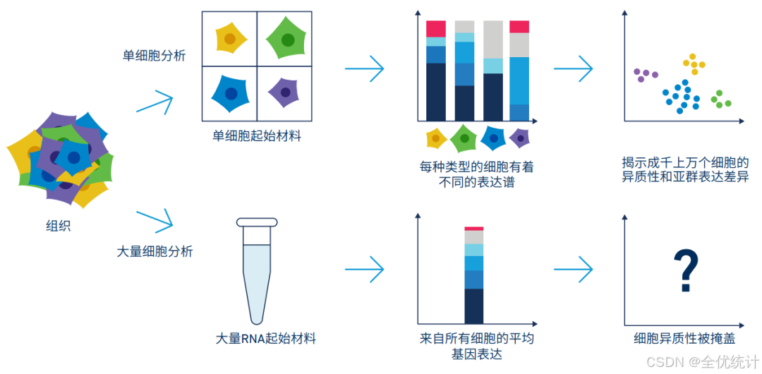 单细胞测序技术(single-cell sequencing)专注于对单个细胞的转录组、基因组、表观基因组和蛋白组进行高通量测序分析,能够揭示细胞之间的差异信息。与传统的混合测序(bulk sequencing)不同,后者针对的是整个组织或细胞团体,得到的是一个整体的平均值,无法反映细胞的异质性。