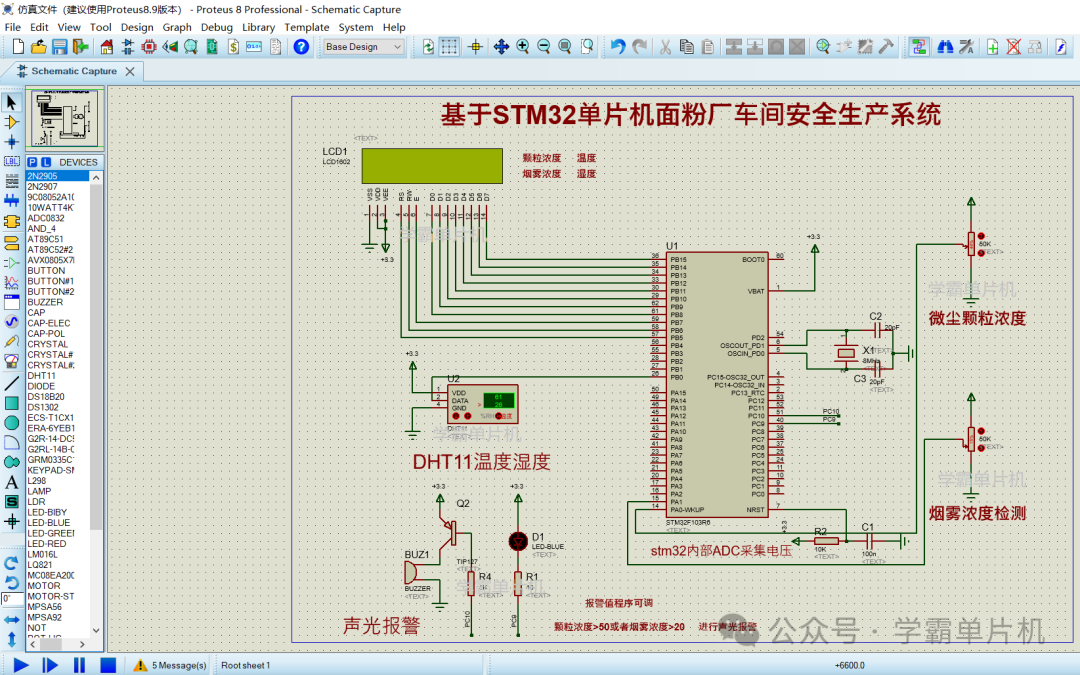 资料编号:187一:功能介绍1、采用stm32单片机+LCD1602显示屏+DHT11温湿度模块+蜂鸣器+LED+电位器,制作一个基于STM32单片机面粉厂车间安全生产系统Proteus仿真;2、通过DHT11温湿度传感器,读取当前环境的温度和湿度,数值显示到LCD1602显示屏上;3、通过微尘颗粒传感器(电位器模拟)读取微尘颗粒浓度,显示到LCD1602显示屏上;4、通过MQ2烟雾传感器(电位器...