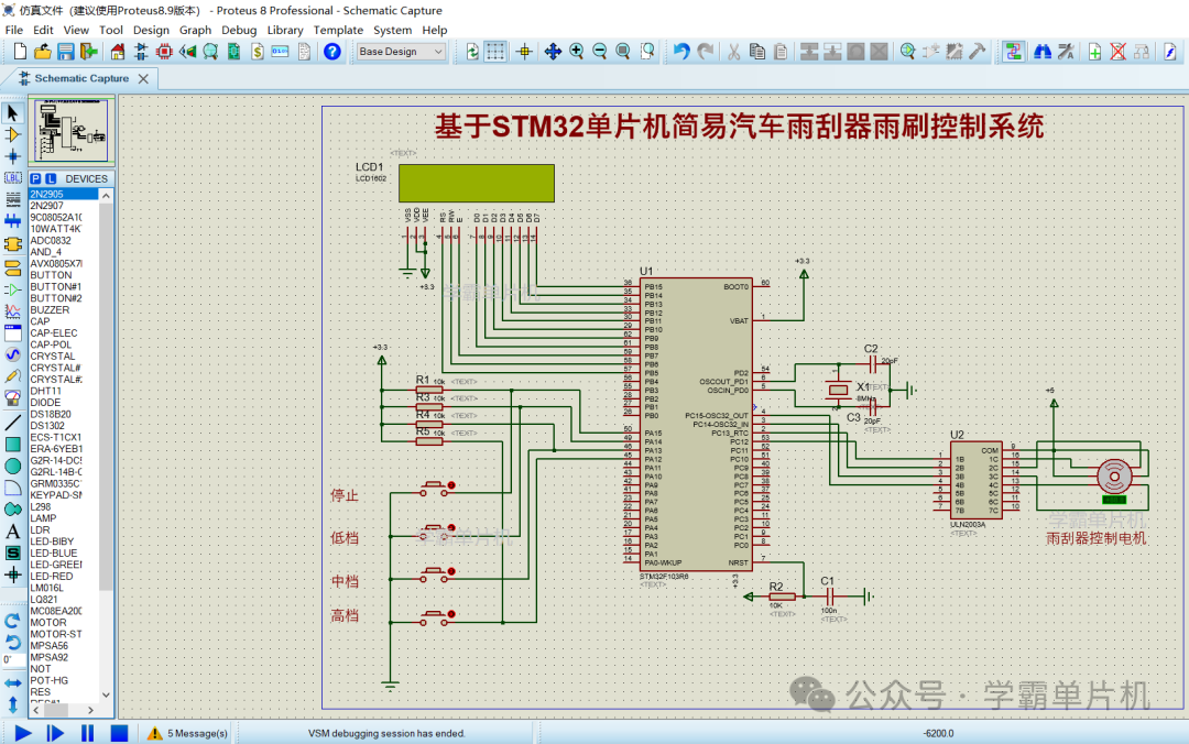资料编号:188一:功能介绍1、采用stm32单片机+LCD1602显示屏+按键+ULN2003驱动芯片+步进电机,制作一个基于STM32单片机简易汽车雨刮器雨刷控制系统Proteus仿真;2、可以通过控制步进电机转速达到控制雨刷的速度;3、可以通过按键调节雨刷的快慢和停止,分为停止、低速、中速、高速四个挡位;4、LCD1602可以显示当前的挡位状态;二:仿真演示视频+程序简要讲解(程序有中文注释...