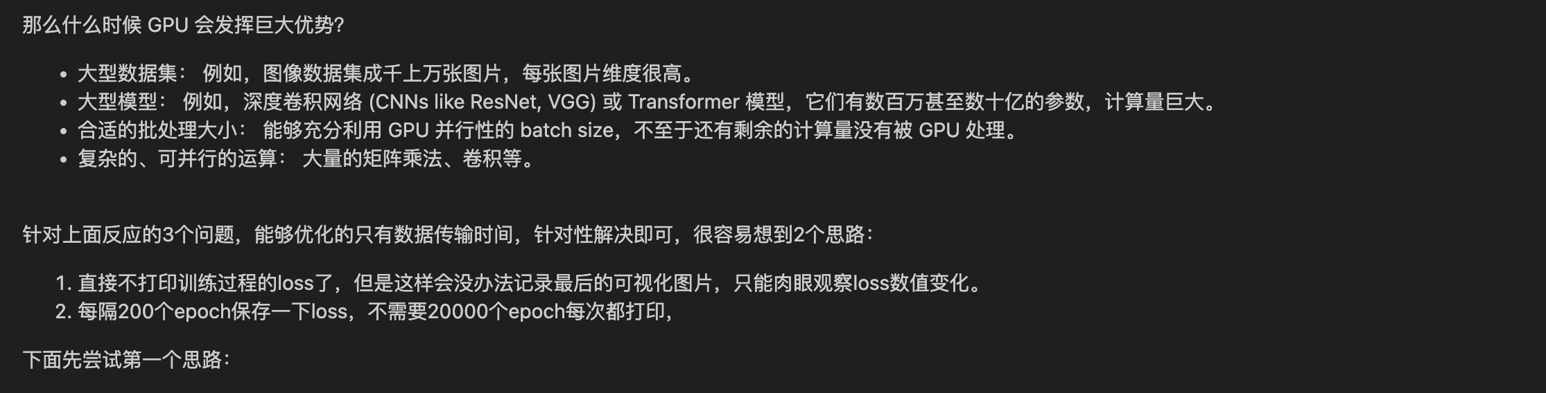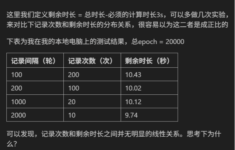 要理解 “记录次数和剩余时长无明显线性关系”,得结合今天学的硬件资源调度、程序运行机制来分析(剩余时长其实是 “记录操作的总耗时”,因为总时长 = 计算 20000 epoch 的基础时长 3s + 记录耗时,剩余时长 = 总时长 - 3s = 记录总耗时):
