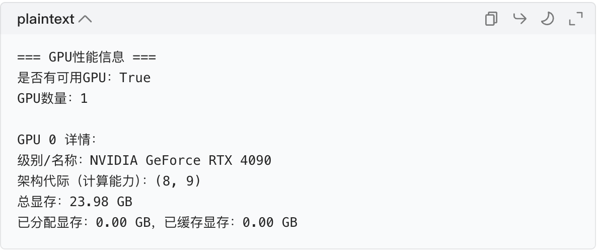 torch.cuda.is_available():检查是否有 GPU(相当于看工厂是否存在)。torch.cuda.get_device_name(i):获取 GPU 型号(工厂规模)。total_memory / (1024**3):把字节转换成 GB(仓库大小)。