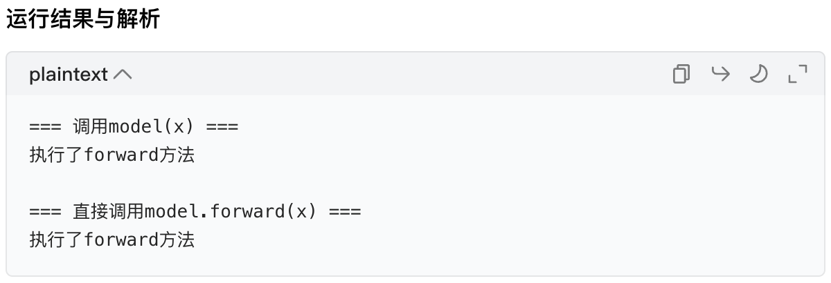 model(x)时,__call__方法在执行forward的过程中,会自动触发注册的钩子函数,把层的输入、输出传给钩子函数。 - 这是调试复杂模型的核心工具,而