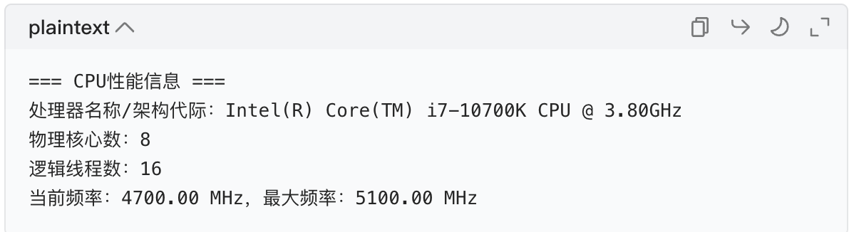 psutil.cpu_count(logical=False):数 “工人数量”(物理核心)。psutil.cpu_count(logical=True):数 “工人 + 工具” 的总数(逻辑线程)。- 不同系统获取处理器名称的方式不同,代码里做了兼容,你只需要运行看结果就行。