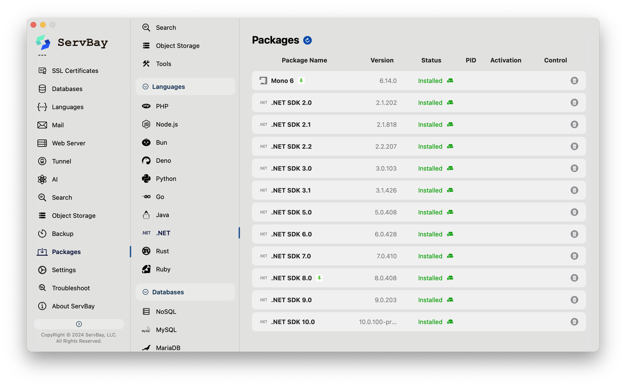 版本管理大师:无论是Windows还是macOS,ServBay都支持从骨灰级的.NET 2.0到最新的.NET 10.0。所以开发者可以在不同项目间无缝切换,再也不用为版本冲突而头疼。