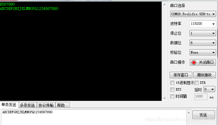 4、接下来,我们再次按下KEY4重新然STM32进入STO模式,然后发送一个比较长的字符串来唤醒STM32,例如发“ABCDEFGHIJKLMNOPQ1234567890”,这时候,我们发现第一次发送之后,竟然会有字符出来,不是说没有吗?而且这些字符和我们发送的不一样,少了,第二次才正常: