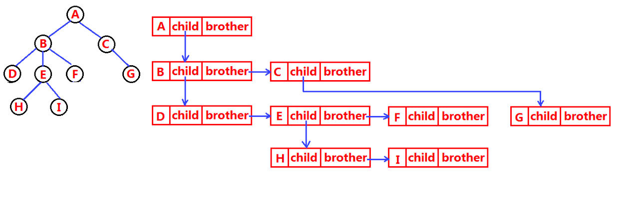 树结构相对线性表就比较复杂了,要存储表示起来就比较麻烦了,既然保存值域,也要保存结点和结点之间 的关系,实际中树有很多种表示方式如:双亲表示法,孩子表示法、孩子双亲表示法以及孩子兄弟表示法 等。我们这里就简单的了解其中最常用的孩子兄弟表示法,如下。