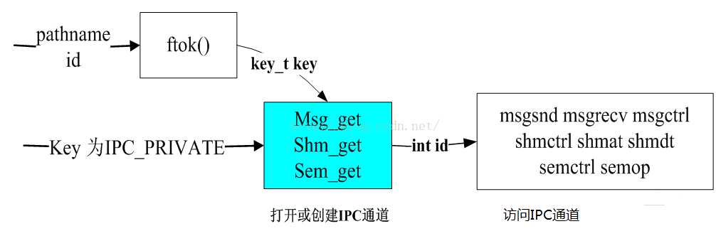 注意:在IPC的通信模式下,不管是使用消息队列还是共享内存,甚至是信号灯,每个IPC的对象都有唯一的名字,称为"键"(key)。通过"键",进程能够识别所用的对象。"键"与IPC对象的关系就如同文件名称于文件,通过文件名,进程能够读写文件内的数据,甚至多个进程能够公用一个文件。而在 IPC的通讯模式下,通过"键"的使用也使得一个IPC对象能为多个进程所共用。