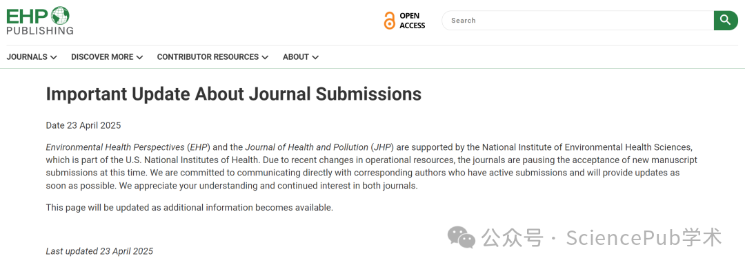环境类中科院 1 区顶级期刊《Environmental Health Perspectives》自2025年4月23日起,在官网发布重磅公告:受运营资源调整影响,即日起暂停接收新投稿件。现阶段尚在投稿流程及处于审稿环节的稿件,后续也将逐步作撤稿处理。
